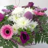 Beautiful low bouquet tied on violet armature base. Includes i.e. germinis, chrysanthemums and ornamental greens.