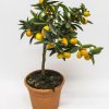 Kumquat plant has white, delightfully fragrant flowers and decorative, edible, yellow-orange small fruits that can be eaten with peel. In summer, the dwarf citrus enjoys the great outdoors, and in the winter, indoor bright and cool place. Watered abundantly in spring and summer, and fertilized every two weeks. Height about 55 cm, pot size 18 cm.