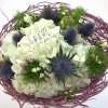 Beautiful low bouquet tied on violet armature base. Includes hydrangea, carnations, eryngiums and ornamental greens.