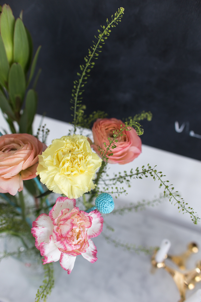 Tein valkoisen asetelman ja toisena värikkään asetelman. Juuri nyt värikkäät kukat tuo niin paljon valoa ja iloa sekä aurinkoa kotiin. Tämä on kiva myös siksi, että osa kukista kestää kauemmin maljakossa, näin ollen nuupahtaneet kukat on helppo ottaa asetelmasta pois ja tarvittaessa vaikka laittaa tilalle uusi tuore leikkokukka.