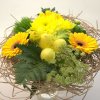 Luonnonruskeaan kimppupohjaan sidottu kaunis matala kimppu. Sisältää krysanteemia, germiniä, neilikkaa, kuismanmarjoja, isosudenporkkanaa sekä koristevihreitä.