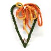Sammal sydänkranssi oransseilla ruseteilla. Korkeus 37,5 cm, leveys 23 cm ja pakusuus 2 cm.