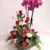 Eritaso istutus neilikoista, ruusuista, orkideasta ja koristevihreistä. Kori kuuluu hintaan. (voi vaihdella hieman tuotteessa).