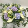 Kuvanmukainen matalaan sidottu kukkakimppu hortensiasta, callasta, inkaliljasta, sekä koristevihreistä.